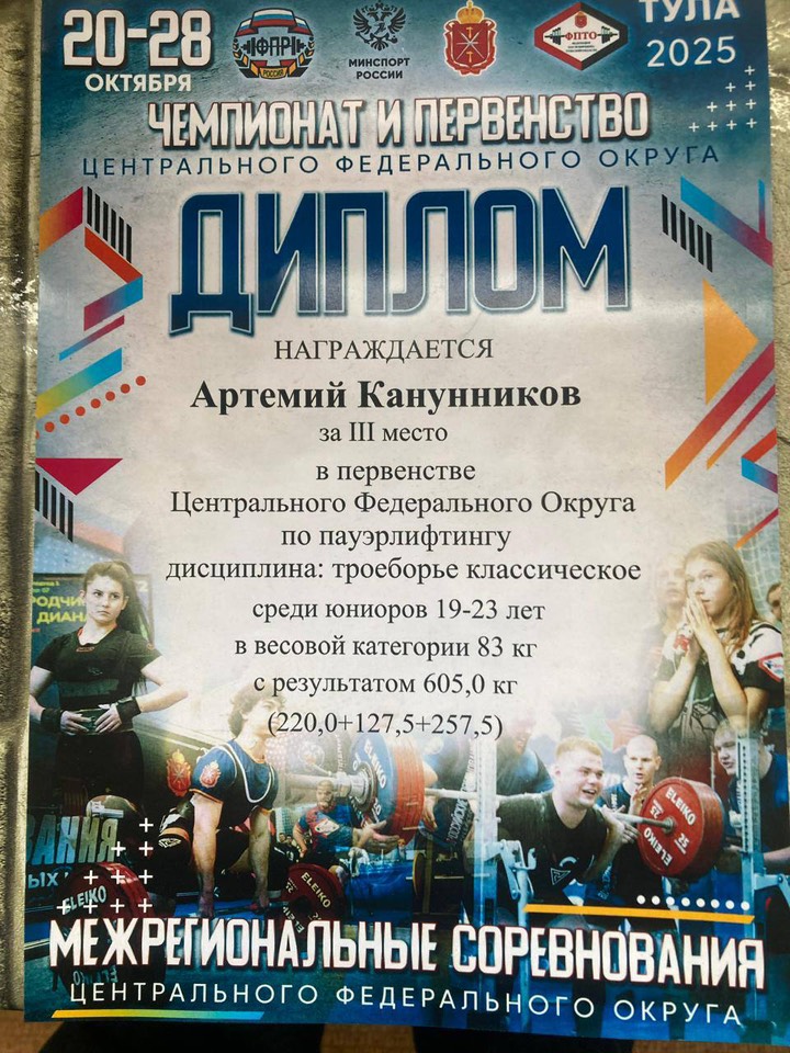 Артемий успешно выступил на Первенстве Центрального федерального округа по пауэрлифтингу в дисциплине классическое троеборье среди юниоров (19–23 года) и завоевал бронзовую медаль!